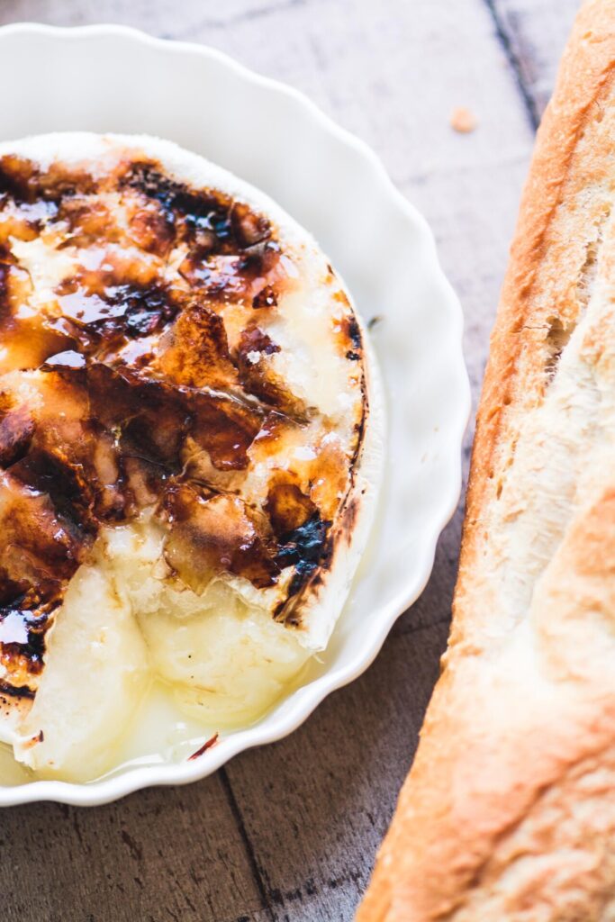 Je schept de kaas zo uit het schaaltje. Dat is niet zo handig met gewone toastjes want die gaan breken. Ik maak zelf toast van sneetjes stokbrood in de oven (crostini) Je hebt en de broodnodige crunch en je kunt er heel lekker mee scheppen.