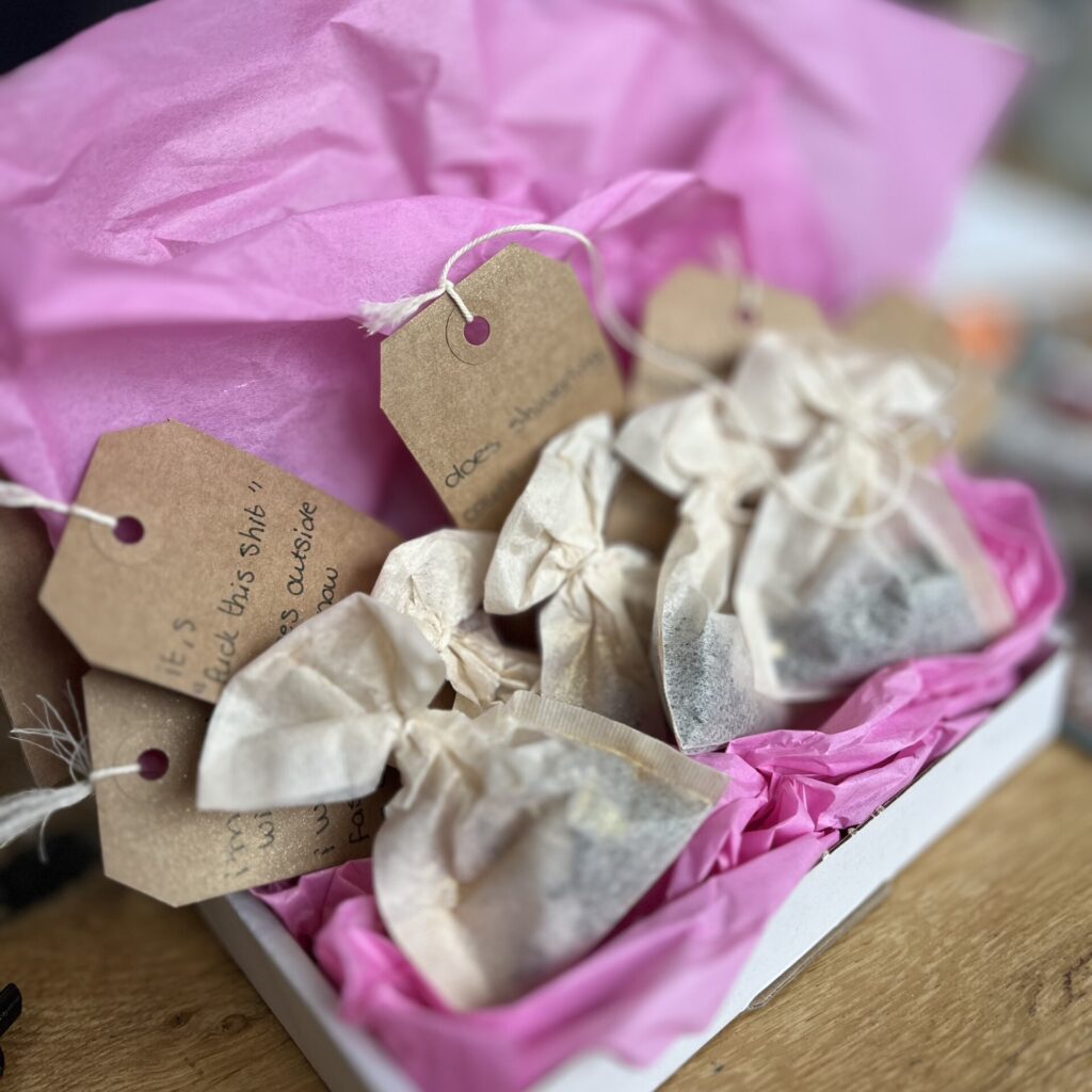 De Glitter-thee box is €9,95 exclusief € 4,95 verzendkosten per box.